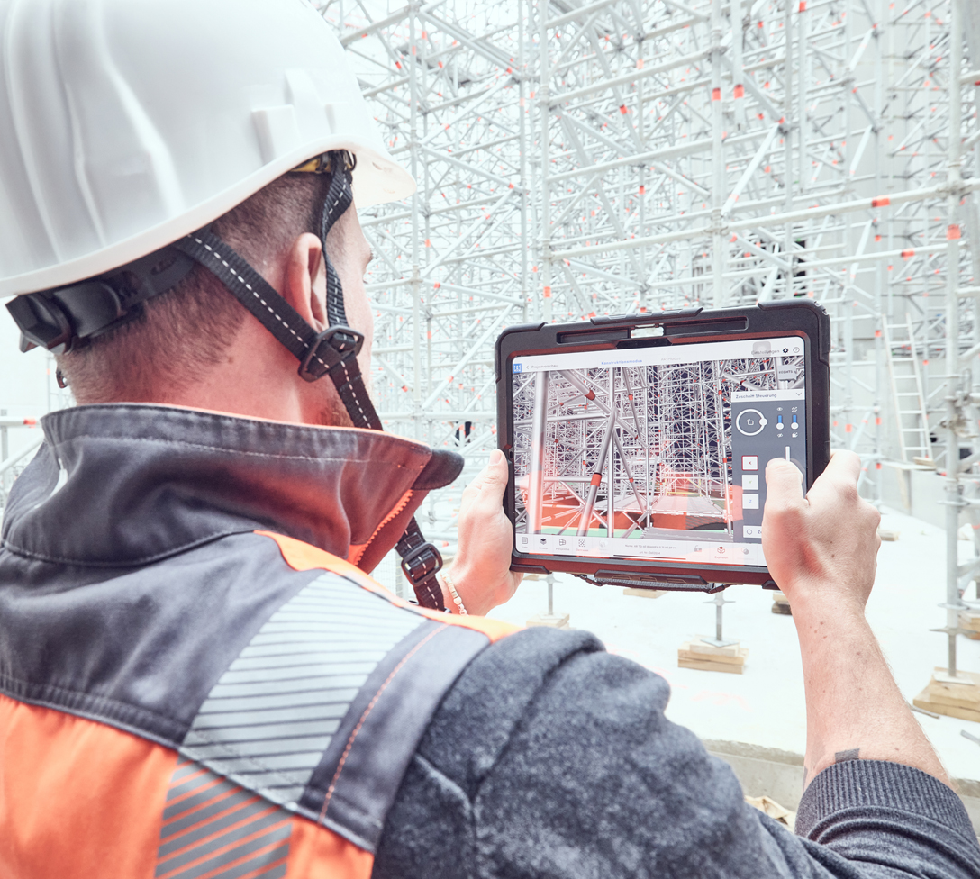 Bei der Montage kam der digitale Service SIM2Field – Produkt des Jahres 2025 – für das punktgenaue Einmessen der Gerüstkonstruktion zum Einsatz, die SIM2Field XR App beim anschließenden Weiterbau. Basis war das 3D-Gerüstmodell aus der Planung mit LayPLAN CAD.