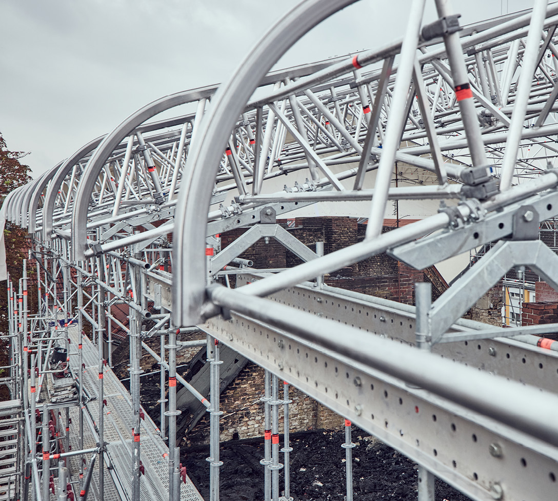 In Berlin stand ein Wohnhaus in Flammen und muss nun saniert werden. Um den Dachstuhl während dieser Zeit vor Witterungseinflüssen zu schützen, montierten die Gerüstprofis von A. Walther Gerüstbau aus Teltow ein Kederdach XL mit rund 20 m Spannweite. Dieses lässt sich dank verschiedener Aussteifungsvarianten auch bei hohen Schneelasten einsetzen und ist wirtschaftlich in der Montage. Dafür sorgen die leichten Bauteile aus Aluminium, die integrierten Kederprofile und die Verbindungtechnik per Einrastklaue. Beim Arbeits- und Stützgerüst gewährleistete das AGS einen schnellen und zugleich sicheren Auf- und Abbau. Die Überbrückung eines angrenzenden Gebäudes war ebenfalls problemlos möglich: mit dem Aluminium-Träger TwixBeam. Eine Lösung mit System.