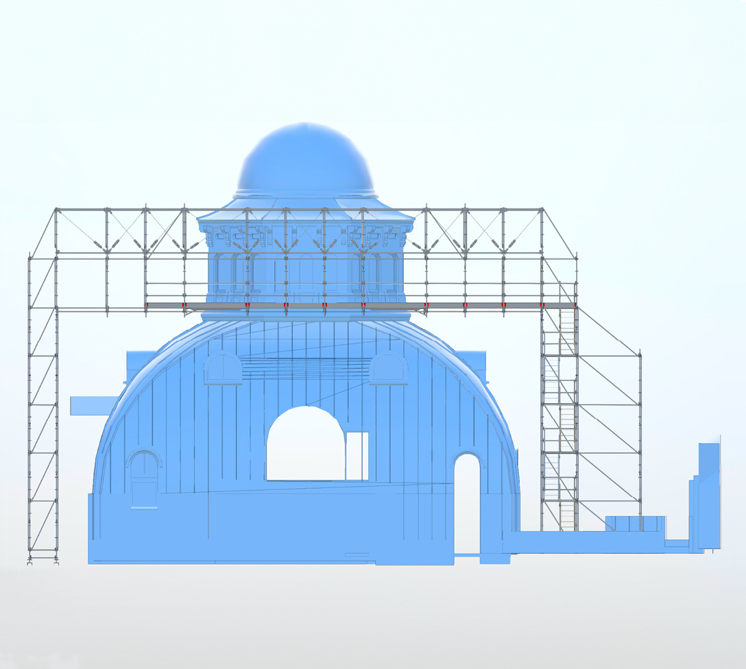The complex scaffolding solution was planned in advance in 3D by Layher’s applications engineers using LayPLAN CAD, and was then adapted, based on the digital scaffolding twin, in consultation with the client, the scaffolding erectors, the trades involved and the safety officers.